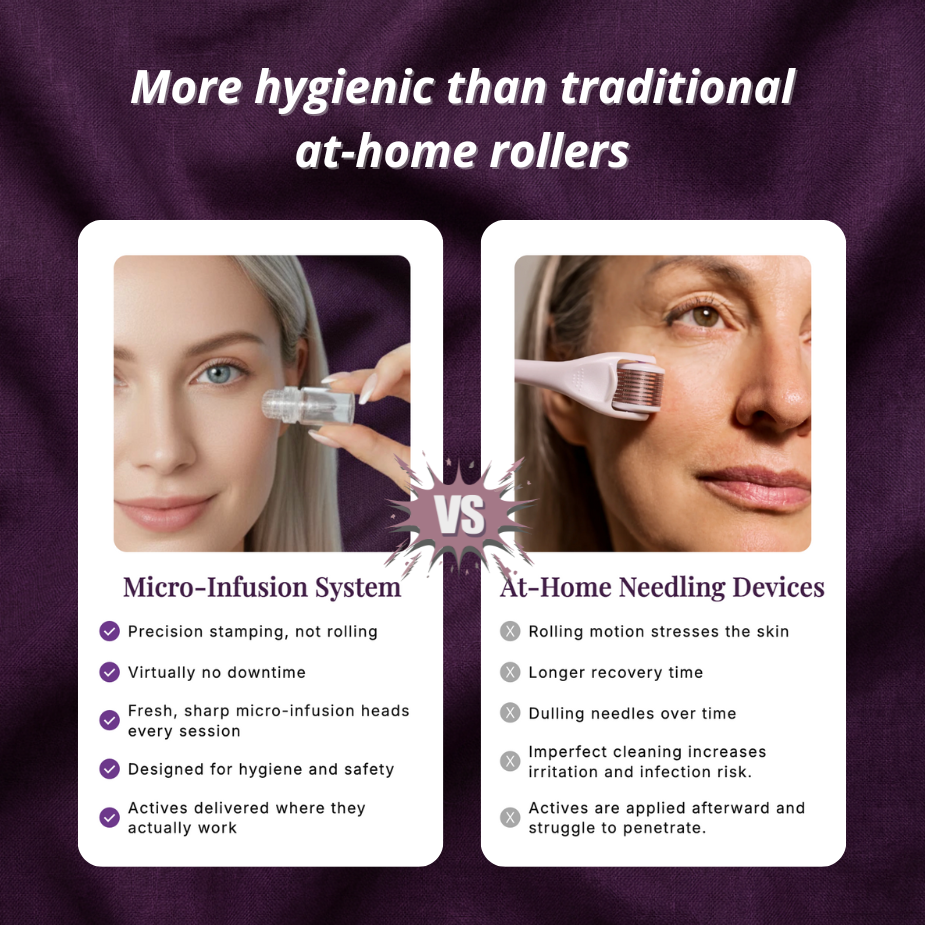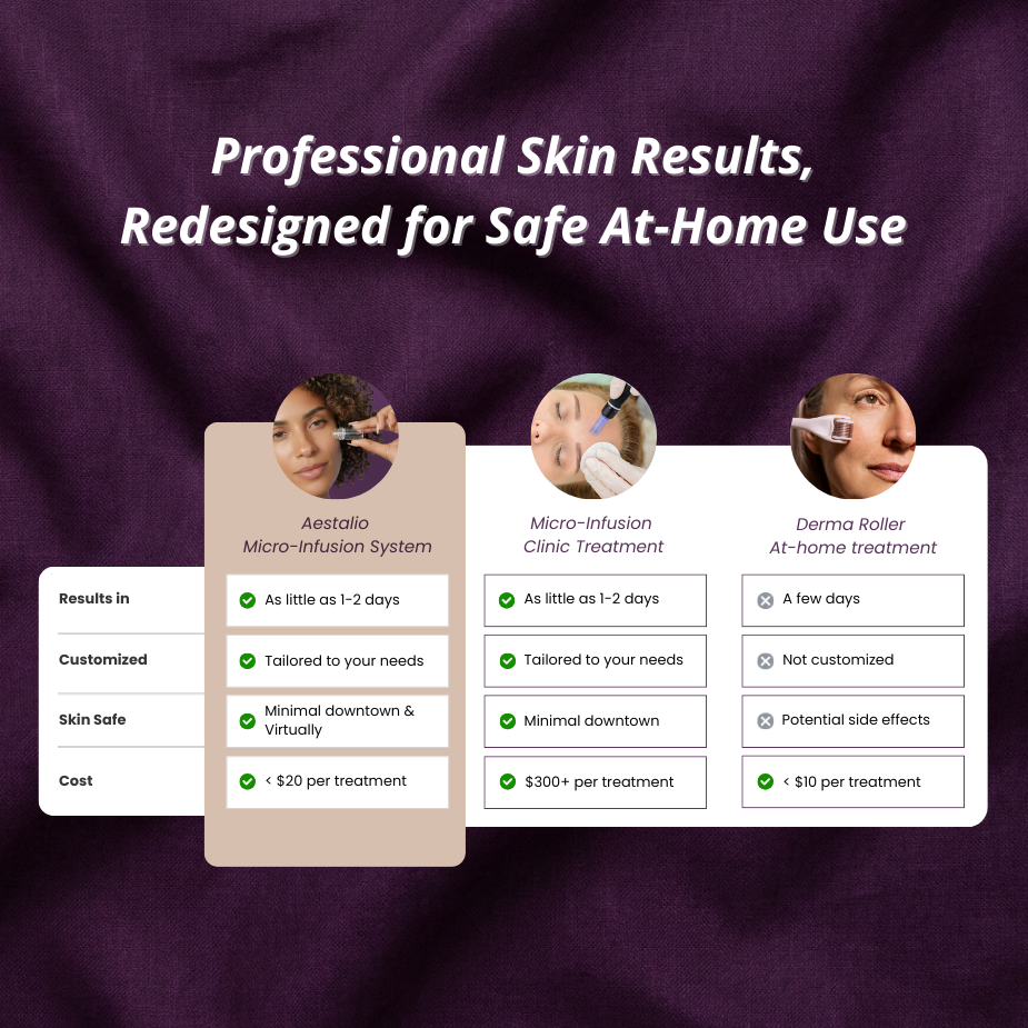 Virtually painless with little to no downtime, the Aestalio Micro Infusion System delivers consistent results without the irritation, infection risk, or guesswork that make roller devices fail—finally giving you clinic-level skin renewal you can trust at home.